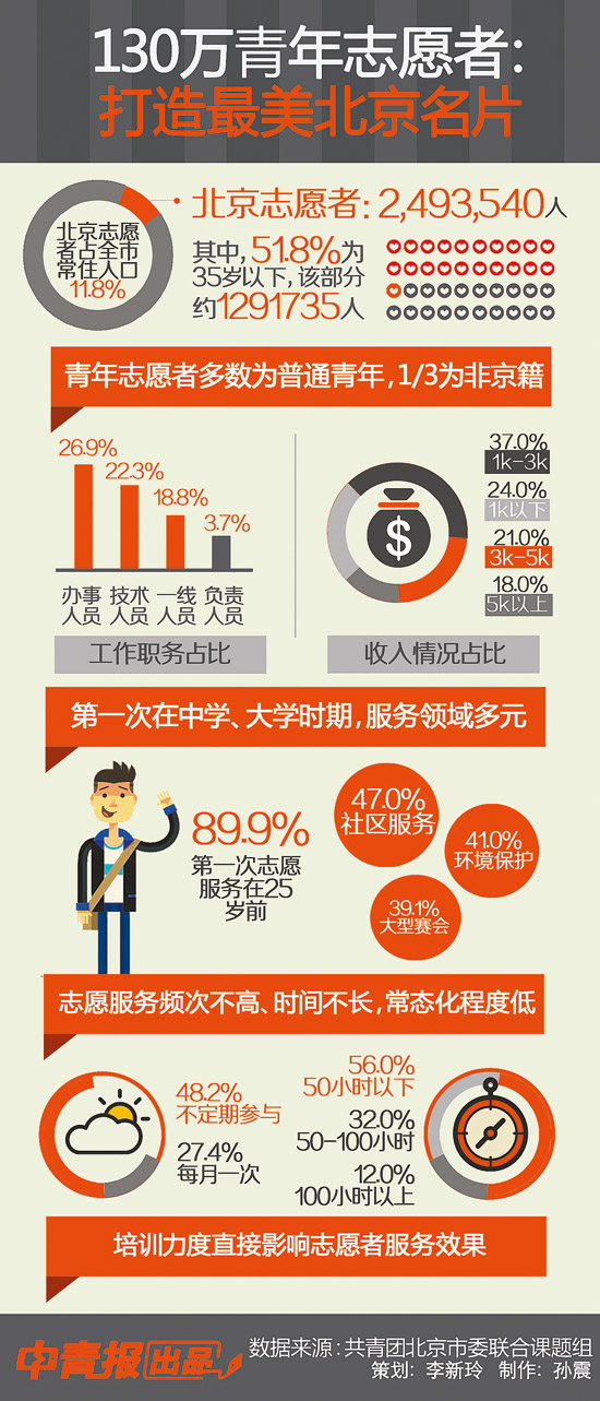 团北京市委进行的“北京青年1%抽样调查”就关注到了像王英姿这样的青年志愿者。截至2015年3月,在“志愿北京”信息平台实名注册的青年志愿者有近130万人,占据北京志愿者总数的半壁江山。