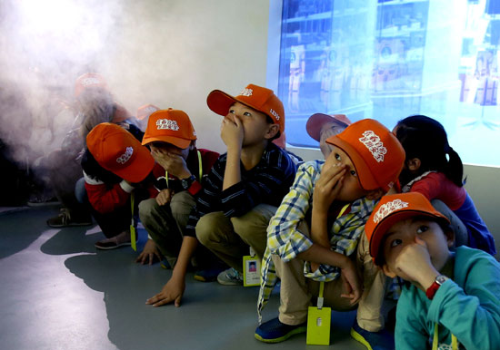 7月8日,在上海市消防局长宁中队,学生们在学习火灾中掩住口鼻逃生的动作要领。当日,2015年上海青少年自护教育主题活动正式启动。新华社记者 刘颖/摄