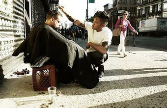 他曾打理女星诺拉·琼斯的如云发丝,也曾为流浪汉的满头乱发设计造型。他的客人有倚在纽约市中心高端美发沙龙的沙发里,也有蜷着腿坐在街边的树桩、背包、牛奶箱。剃掉打结长发的大叔对镜感慨“终于又看到了自己”,跛脚的露宿老人刮脸时对他讲起曾当厨师的经历。