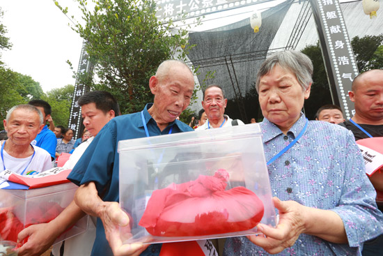 7月18日,长沙春华山抗战浙江籍阵亡将士“英灵回家”公祭启灵仪式在春华镇抗日阵亡将士墓园举行。5户英烈家属代表以及杭州市殡葬协会、浙江安贤陵园等单位,共同把长眠在这里的118位浙江籍抗战阵亡将士遗骸带回家乡。CFP供图