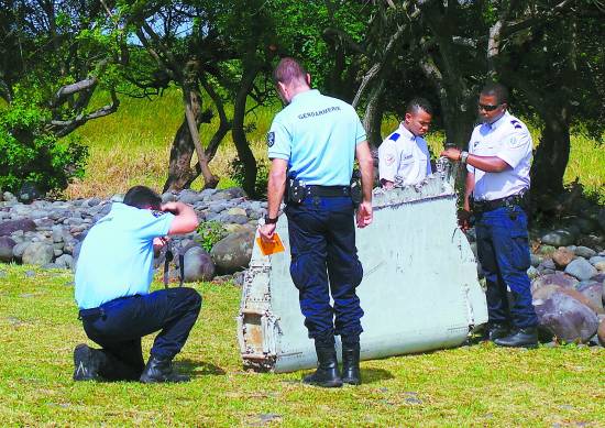 7月29日,在法属留尼汪岛,警察查看一块飞机残骸。印度洋法属留尼汪岛民众29日发现了这块飞机残骸。