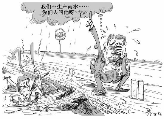 在陕西省榆林市大河塔镇暖水沟村,一场大雨过后,因高速公路排水渠质量不达标,被大雨冲毁,连带着村道垮塌了30余米,村民们出行的道路被切断。高速公路管理方称:附近道路和庄稼地的安全不在我们考虑范围之内,再说雨水不是我们生产的。(《华商报》8月31日)