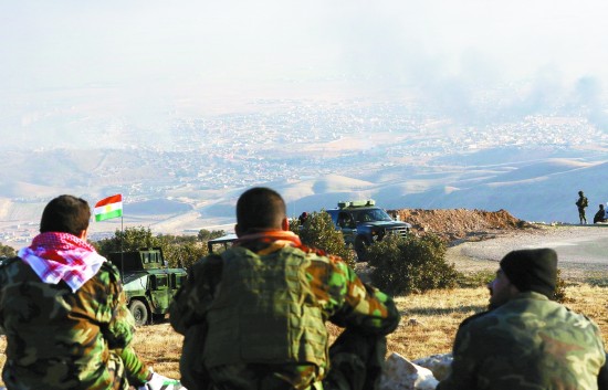 11月12日,在伊拉克北部辛贾尔镇,库尔德武装人员望着硝烟弥漫的远方。