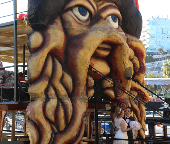 11月11日,在土耳其安塔利亚,一对新婚夫妇在卡莱伊奇老城区港湾一艘游船上拍婚纱照。