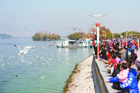 11月20日,市民和游客在昆明滇池草海大堤上与红嘴鸥嬉戏。当日,抵达昆明越冬的红嘴鸥在滇池草海上空翩翩起舞,吸引众多市民与游客前来观赏。每年10月底至11月初,成千上万只红嘴鸥飞抵昆明越冬,成为“春城”的一道风景。