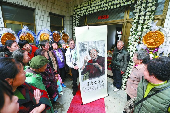 11月22日,在江苏南通通州区西亭镇草庙村,当地画家孙庭钦(中)带着以宋英老人为主题的画作前来送别。家住江苏南通的“中国好人”宋英因病20日去世,享年99岁。2012年1月,宋英捐出家中全部积蓄100万元,成立“姜美善宋英”慈善基金会,帮助贫困老党员以及困难家庭的学生。2014年2月,宋英腾出100多平方米住房,留给政府作为青少年教育基地,老人自己与侄子一家住在一起,彻底“裸捐”。