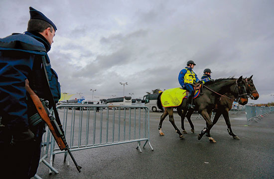 11月29日,法国警察在巴黎北部市郊的气候变化大会主会场巡逻。在近期巴黎发生了重大恐怖袭击的特殊情况下,法国将动用11000名警察和宪兵,切实保障巴黎气候变化大会安全举办。政府已安排2800名警察和宪兵在气候变化大会主会场、巴黎北部市郊的布尔歇展览中心负责安保。《联合国气候变化框架公约》第21次缔约方会议(即巴黎气候变化大会)将于11月30日至12月11日在巴黎举行,约150名国家元首或政府首脑参会。新华社记者 周磊/摄