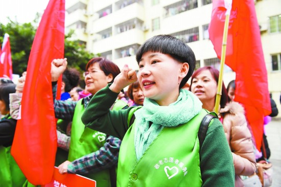 12月5日,志愿者邓玉琴(前)等在敬老志愿者服务总队成立会上宣誓。