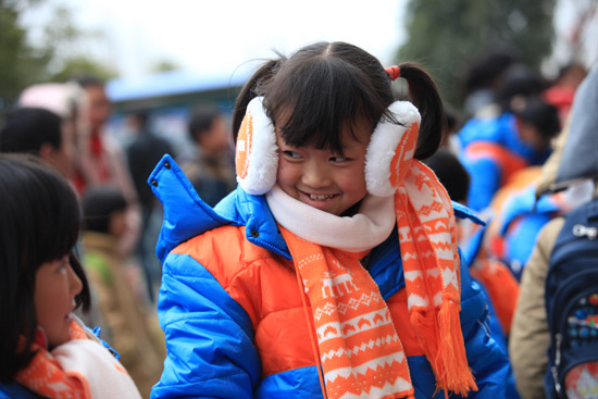 12月18日,云南省昭通市昭阳区旧圃镇沙坝明德小学,一名学生穿上“壹基金温暖包”内的新棉衣后十分开心。12月中旬,昭通市收到了壹基金发来的1127个温暖包,目前,在昭通市志愿者的帮助下,已经有227名贫困学生领到了“壹基金温暖包”。张广玉/CFP