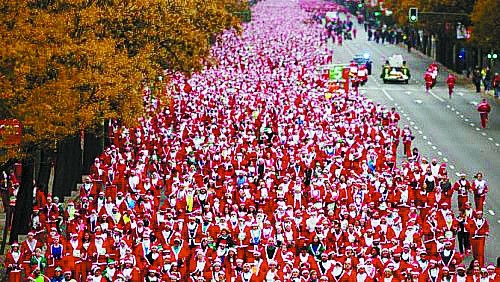 圣诞老人入城了!据外媒报道,西班牙首都马德里近日举行第4届圣诞老人赛跑,逾1万人打扮成圣诞老人参加。比赛队伍沿着西甲球队皇家马德里主场班拿贝球场的街道跑5.5公里,场面壮观,人数更打破去年5173人的吉尼斯世界纪录。