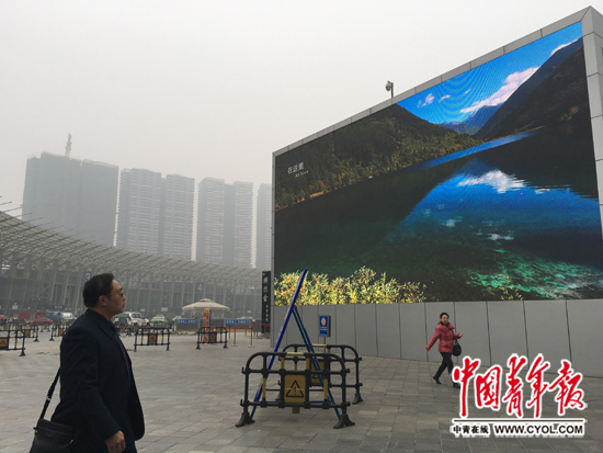 2015年12月31日上午,成都世纪城国际会展中心,电子屏幕正在播放某景区的广告画面。当天,成都市环保局发布的实时空气质量指数在最低值239和最高值297之间。12月28日起,四川省遭遇区域性大气污染天气,29日晚上紧急启动了区域Ⅲ级预警(黄色)。31日16时,成都、自贡、德阳、绵阳、眉山、宜宾、雅安7市为重度污染。德阳、成都等地先后取消了原计划元旦举行的新年长跑活动。气象和环保部门预计,污染将持续到2016年1月5日。 本报记者 王鑫昕/摄