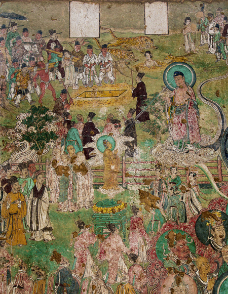 佛国世界千变万化、无所不能。维摩诘居室,不过一丈见方,竟然汇聚了“八千菩萨,五百声闻,百千天人”。不知是维摩诘将居室变大,还是把众菩萨变小,不过这“方丈”之室从此名垂佛典。大云院弥陀殿的五代壁画残存约20平方米,除去扇墙上的观世音、大势至二菩萨像和几不可辨的“西方净土变”,佛殿东面山墙上的此幅《维摩经变》也只剩10余平方米,世俗的青睐最终落到了此处,不违逆岁月,失去的走失了,在现代美好生活的共建中,残存的壁画在懂得佛理的人心中获得了至高无上的地位,依旧是顶礼膜拜的对象。世俗大地上,有多少人明白这方丈之数!