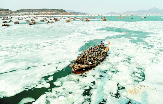 1月21日,辽宁大连,海上养殖户在抢运海产品及海上物资。冰面扩大,多艘渔船被“钉”在冰面上。