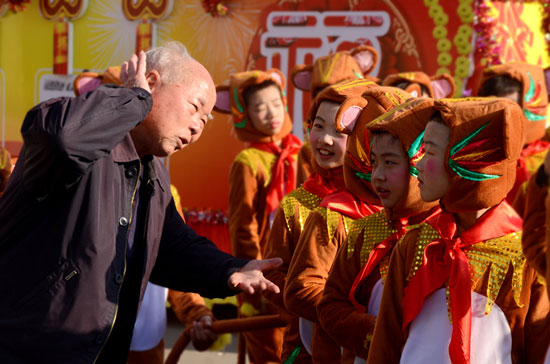 2月8日是大年初一,广东省潮州市饶平县游行锣鼓队为全县人民带来了一场精彩绝伦的拜年演出。孩子们扮演着小猴子的角色,手捧仙桃,一路上兴高采烈,仿佛真的是一群小猴子。领队的老爷爷在候场之时,与小演员交流猴子的动作,并示范如何演才更有猴子的韵味。(惠州学院 江樱翘/摄) |
