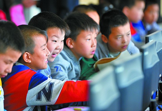 4月11日,在石家庄市山区教育扶贫项目学校平山县北冶小学,学生们在微机室上课。