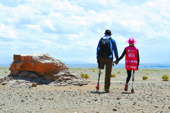 5月22日,残奥会跳高冠军侯斌(左)和羌族残疾歌手尔玛阿依行走在戈壁上。