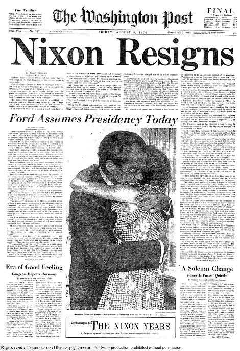 警方在5人的房间里发现了窃听设备、数十张崭新的百元美钞,以及原CIA特工霍华德·亨特(E. Howard Hunt)亲笔签名的入住单。此后的调查显示,尼克松正是这次行动的授意者。1974年8月8日,尼克松迫于压力宣布辞职,因此成为美国历史上首位辞职的最高领导人。从此,“水门事件”作为美国政坛丑闻的代名词,一次次出现在各类媒体上。