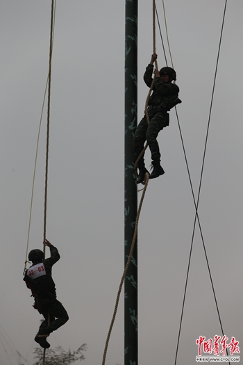 11月6日,武警部队举行首届“巅峰”特勤分队尖子比武竞赛。图为特战队员参加“攀登射击”课目比武。中国青年报·中青在线记者 李建泉/摄