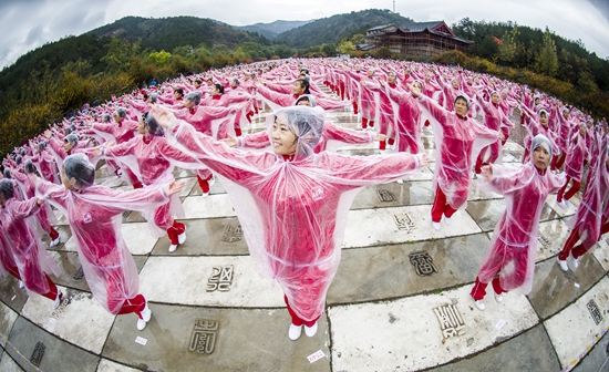 11月7日,在武汉黄陂云雾山,广场舞爱好者一同起舞。当天上午,在北京等14个城市的不同场地上,50085人共同起舞,创下新的最大规模排舞(多场地)吉尼斯世界纪录。 新华社记者 肖艺九/摄