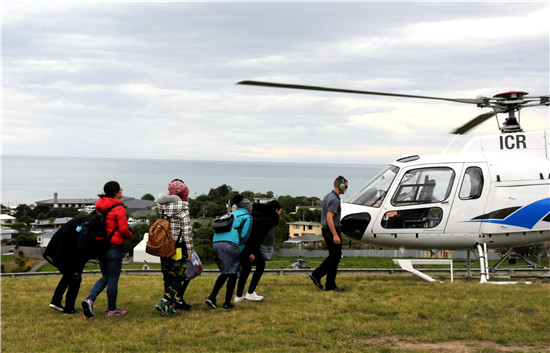 11月14日,在新西兰凯伊库拉小镇,地震受困游客准备乘直升机撤离。通过多方努力,中国驻新西兰南岛克赖斯特彻奇(基督城)总领馆14日上午调集两架直升机,前往发生强烈地震的新西兰小镇凯伊库拉。截至发稿时,已有数十名中国被困游客获救,总领事馆工作人员仍留在凯伊库拉现场协助被困中国游客。新西兰南岛中部地区当地时间14日凌晨发生7.5级地震,地震已造成两人死亡,民防部门在地震后发布海啸紧急预警。
