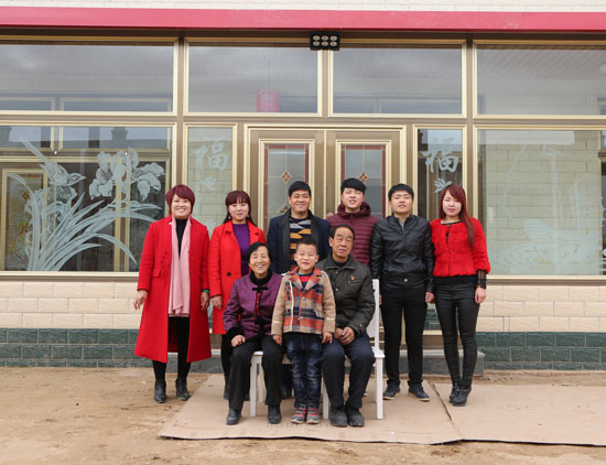 贺家的新居就出现在土路尽头。在一段硬化过的路面旁,27户灰色砖瓦房整齐的排列着。沿袭“腊月不搬家”的乡俗,贺家是唯一赶在腊月前装修好的一户,墙面贴着米黄色瓷砖,院墙用红砖砌成。门窗是村里时兴的落地玻璃样式,描着花鸟鱼虫图案,写着“一帆风顺”这样的吉祥话。门口的水泥路面通往集镇,现代化的养鸡场、粮食加工厂和采油厂在这里汇聚。