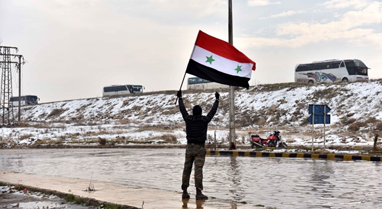 12月22日,载有反政府武装人员的大巴车队离开叙利亚北部城市阿勒颇,一名叙利亚男子向车队挥舞国旗。据叙利亚军方22日消息,最后一批困守在叙北部城市阿勒颇的反政府武装人员及其家属当天上午开始撤离该市。新华社记者 杨臻/摄