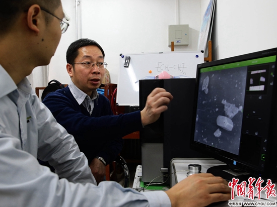 1月3日,记者来到北京化工大学高分子纳米复合材料实验室采访,观摩通过台式扫描电子显微镜观看雾霾颗粒的实验。