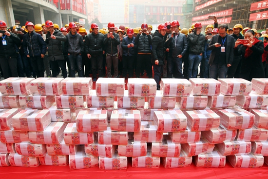 1月18日,西安,在一工地上,一派喜庆热闹景象,300多名辛苦一年的工人领到工资和奖金后,个个笑逐颜开。