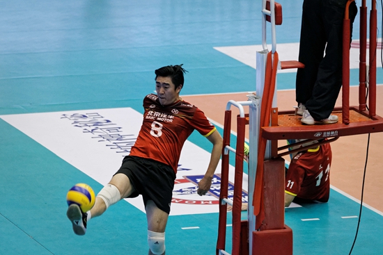 北京时间2月12日,2016~17中国男排联赛半决赛,四川队1∶3不敌北京队,后者晋级决赛。图为北京男排二传手康慷出脚救球。视觉中国供图