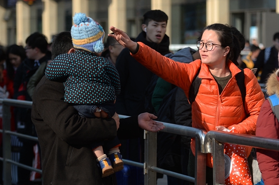 2月12日,济南火车站进站口,一位即将进站的旅客与亲人告别。