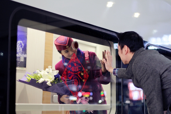 2月13日,重庆准备开往成都的G8526次列车站台前,列车长蒋海霞手捧鲜花与爱人告别。当天是这名90后列车长出乘的日子,“情人节”将至,她和爱人分隔两地,在自己的春运岗位上度过。刘忠建/摄