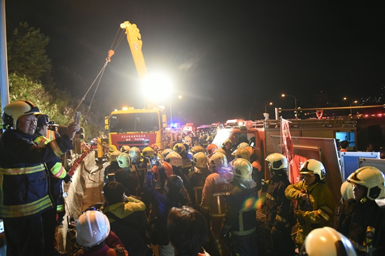 2月13日晚上9时许,台湾一游览车在台北市南港附近发生翻车事故。这是13日晚拍摄的事故现场。