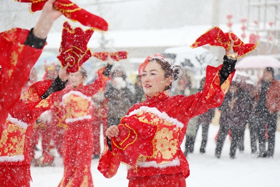 2月21日上午,河南三门峡市渑池县苏秦村,演员在雪中表演。当日,苏秦故里传统庙会在苏秦村龙耳寺举行。