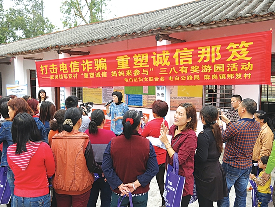 从2014年开始,电白区从64个区直属综治成员单位中,抽调出精干力量230人,组成64个工作组,带经费、带经验、带物资分别进驻麻岗镇、树仔镇35个村(居)委会,脱产驻村,每季度更换一次,目前已进驻第5批。驻村工作组通过召开村民大会、党员大会等不同方式方法进村入户开展宣传、排查、法制教育,并建立了反诈宣传路及反诈宣传长廊,每周一次到在逃人员家里做家属工作,规劝在逃人员投案自首,定期播放反诈专题片等深入宣传发动反诈工作。