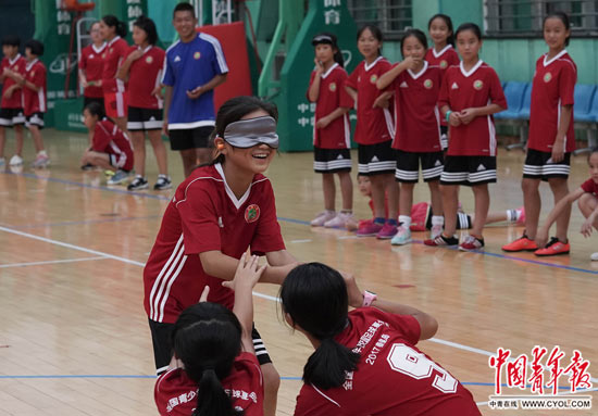 8月13日至23日,2017年全国青少年校园足球夏令营小学组总营活动在国家体育总局秦皇岛训练基地举行。8月14日晚,参加夏令营活动的女乙组球员进行了一场别开生面的趣味游戏。据游戏的编排者曹宏波老师介绍,这些游戏主要训练小球员相互配合和协作,切合足球这项集体运动。如“无敌风火轮”,要求小球员们自己用报纸和宽胶带制作成履带,大家要步调一致,才能快速前进;“坐地起身”,一个人是站不起来的,必须依靠大家的力量,人再多,也能起来;“千里传音”,需要大家用特定的方式,把信息传达给对方。场面最热烈的要算是“盲人回家”,整个队伍分成8个小组,每组选出一名队员,蒙上眼睛,各组的队员发出声音,但不能说话,队员根据自己队友的声音,辨别方向,回到队伍中。现场声音很嘈杂,有一个组想出了个好主意,唱起了歌,引导“盲人”队友回家。