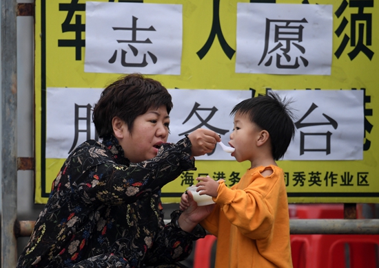 2月22日,在海口市秀英港志愿服务台,一位母亲将刚刚领到的粥喂给孩子吃。