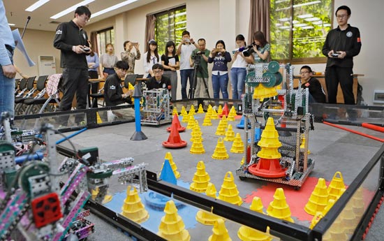 5月4日,西安交大大学生现场演示机器人操控。此前,西安交大蝉联VEX机器人世锦赛全能总冠军并包揽全部金牌。VEX机器人世界锦标赛是一项由美国机器人教育及竞赛基金会主办,加利福尼亚州立大学、卡内基梅隆大学、加州未来基金会等多家教育和商业机构支持协办的教育型国际机器人大赛。视觉中国供图