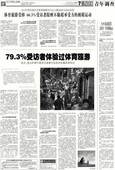 上周,中国青年报社社会调查中心联合问卷网,对2004名受访者进行的一项调查显示,61.2%的受访者认为体育旅游受欢迎是因为它可以让人既运动又亲近自然,55.4%的受访者认为这项活动充满活力,54.5%的受访者认为体育旅游新鲜刺激。66.3%的受访者建议参与体育旅游要量力而行,不做超出身体承受力的极限运动,57.4%的受访者建议想体验体育旅游的人加强日常锻炼,掌握相关运动要领和技能。