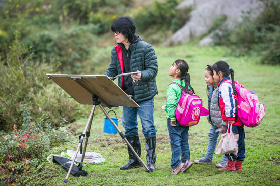 10月23日,贵州省大方县兴隆乡菱角村,来自华南师范大学美术学院的师生在写生,当地孩子好奇围观。视觉中国供图