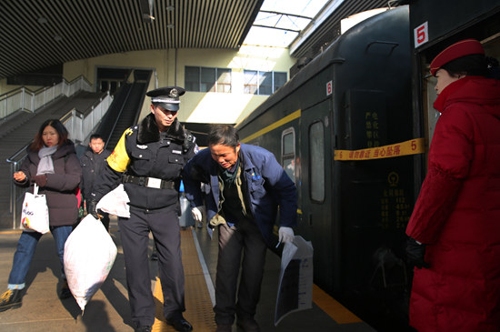 1月13日,农历腊八节,太原铁路公安局青年民警在太原火车站站台为旅客提供帮助。近日回乡旅客增多,太原铁路公安局团委安排更多的青年骨干民警到客运岗位,增班加点,为旅客排忧解难。葛晨浩/摄