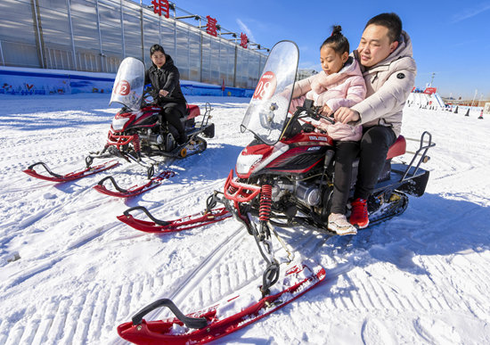 2月17日,在河北省廊坊市广阳区“冰雪嘉年华”现场,市民在体验雪地摩托。近日,河北省廊坊市广阳区举办 “冰雪嘉年华”亲子互动活动,冰滑梯、雪地摩托、雪地足球等多个项目让市民尽情享受冰雪户外活动的快乐。新华社记者 李晓果/摄