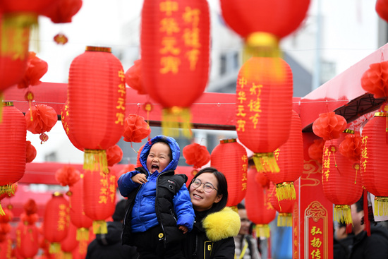 2月17日,小朋友和家长一起在安徽省合肥市包河区罍街举办的元宵灯谜节上猜灯谜。元宵佳节临近,各地举行丰富多彩的民俗展演活动,热热闹闹迎元宵。新华社记者 刘军喜/摄