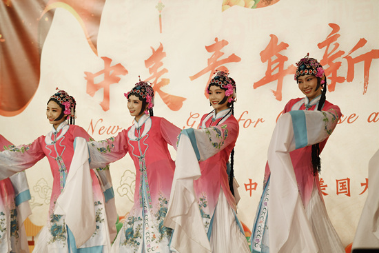 2月16日,在美国首都华盛顿,演员在中美青年新春联欢活动上表演。当日,约500名中美青年在中国驻美大使馆欢聚,庆祝中国农历新年以及中美建交40周年。
