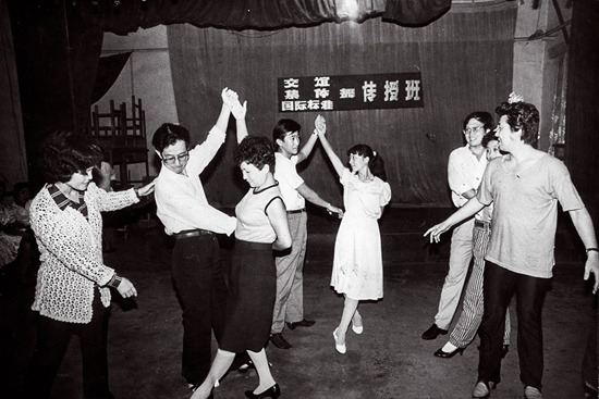 1985年,山东济南,从部队文工团二次转业的妈妈(左一)教市民跳当时流行的交谊舞。妈妈13岁参军当舞蹈演员,曾受到周恩来总理接见。2016年,73岁的妈妈突发脑梗导致半身不遂,但她依然热爱舞蹈,还会在病床上指导孙女跳舞。(郝鑫城)