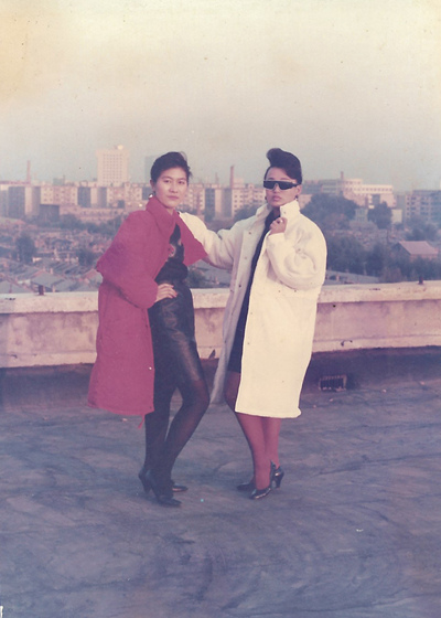 1990年,辽宁沈阳,刚刚大学毕业的母亲(左)在一家中港合资的服装厂工作,那时正好有个时装大赛,母亲便客串了一回模特,穿着设计师设计的服装在天台拍了几张“时装大片”。(斯琪)