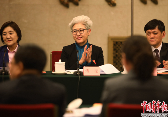 3月6日,十三届全国人大二次会议内蒙古自治区代表团举行全体会议,并对中外媒体开放。全国人大外事委员会副主任委员傅莹在听会。中国青年报·中青在线 中国青年网记者 李建泉/摄