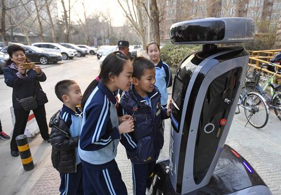 3月19日,智能巡防机器人“梅宝”吸引梅园社区的孩子们围观。近日,一台名叫“梅宝”的智能巡防机器人在北京市丰台区东高地街道梅园社区落户,开始执行社区巡逻任务。这台被居民称为“机器人探长”的智能机器人由北京航天自动控制研究所研制,可在社区内进行陌生人识别预警、视频信息采集、热成像火情识别、居民生活服务提示、人机互动交流、夜间巡逻安保等众多服务。新华社记者 李欣/摄