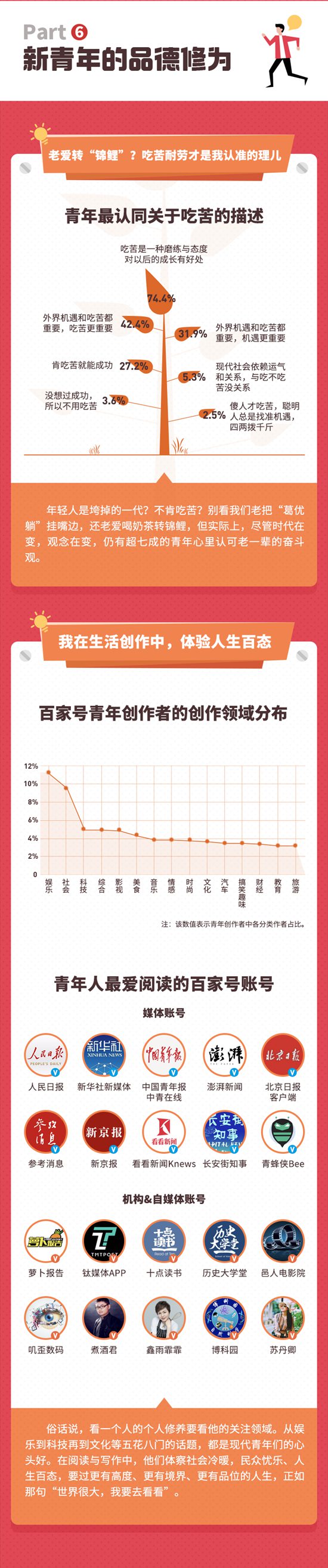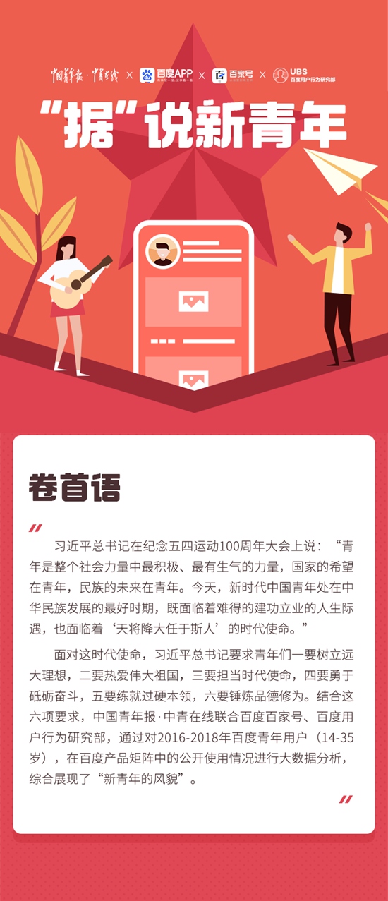 如何找寻自我?如何实现梦想?如何不负青春?如何肩负时代使命?这是当代不少青年心中的困惑。近日,习近平总书记在纪念五四运动100周年大会上,给新青年提了六点要求。在这六方面,当代青年的表现如何?中国青年报·中青在线联合百度百家号、百度用户行为研究部,通过对百度青年用户(14-35岁)进行大数据分析,并面向31709名青年用户进行问卷调查,发布《“据”说新青年数据白皮书》(以下简称“白皮书”),综合描绘了一幅生动的“当代新青年画像”。