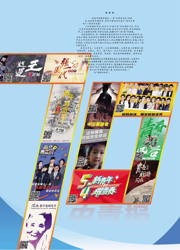 我灵活多变,大显身手。从纸媒到融媒,从随手拍小视频到大制作微电影。在报上、网上、客户端上,处处可见我身影,我沿着移动互联网光纤,用有思想、有温度、有品质的融媒精品,推动社会进步,服务青年成长。
