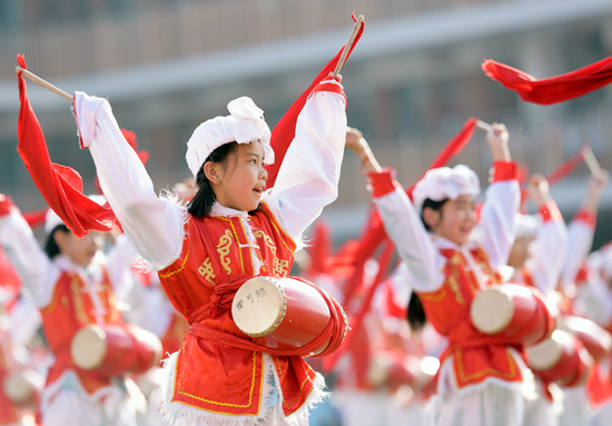 5月9日,呼和浩特,清水河县城关镇第一小学学生在该校体育节开幕式上表演安塞腰鼓。安塞腰鼓是陕北的汉族民间舞蹈,2006年被列入第一批国家级非物质文化遗产名录。内蒙古呼和浩特市清水河县城关镇第一小学从2013年起将安塞腰鼓列入学校的校本课程,聘请民间艺人任教,经过6年的教育和培养,全校1600名教师和学生都学会了安塞腰鼓表演技艺,让这一古老的中华文化在校园中得到传承。王正/视觉中国